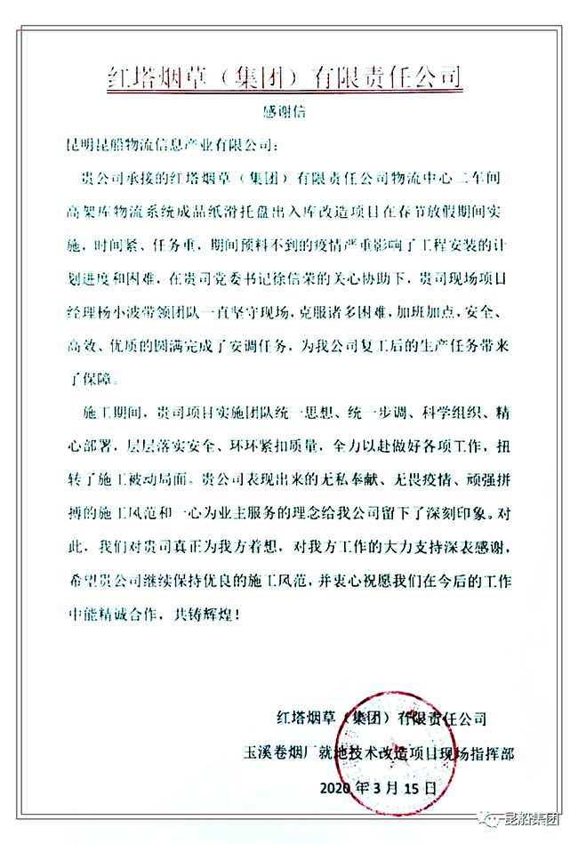困難面前不畏艱險,疫情面前逆行而上,物流公司實施團隊用他們的無私奉獻,為昆船物流再一次樹立了口碑,爭取了榮譽,公司發展過程中,用戶的認可是的必不可少的條件,公司全體職工將努力向優秀的團隊和職工學習,全力以赴為公司高質量發展做出貢獻。
